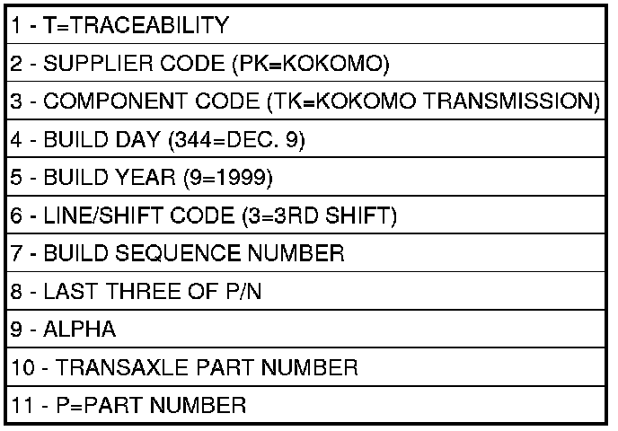 The label contains a series of digits that can be translated into useful information such as transaxle part number, date of manufacture, manufacturing origin, plant shift number, build sequence number, etc.