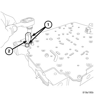 6. Remove the bolt (1) at the pressure control solenoid (2).
