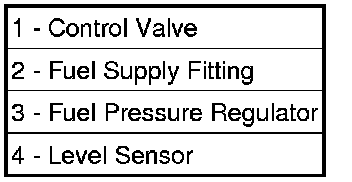 Top view of the right side fuel module with control valve (1), fuel supply fitting (2), fuel pressure regulator (3), and level sensor (4)