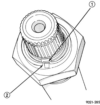 16. Install shim (1) on output shaft (2). Apply small amount of petrolatum onto the shim to hold it in place. Use the original shim as a starting point. If original shim is not available, use the thickest shim available.