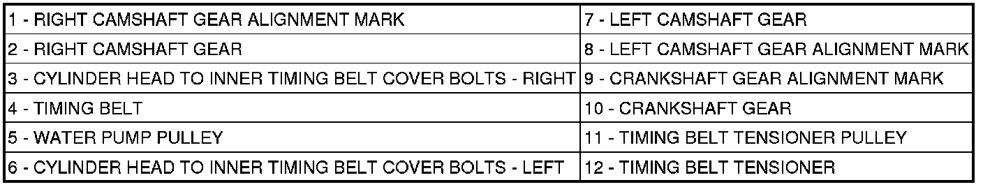 Remove the outer timing covers. Rotate the crankshaft until the pointer on the crankshaft sprocket (10) aligns the TDC mark on the oil pump (9). Check to determine if the camshaft sprocket (2, 7) timing marks (1, 8) are aligned with the marks on the inner timing cover. It may take an additional full revolution of the crankshaft before the camshaft sprocket marks are aligned.