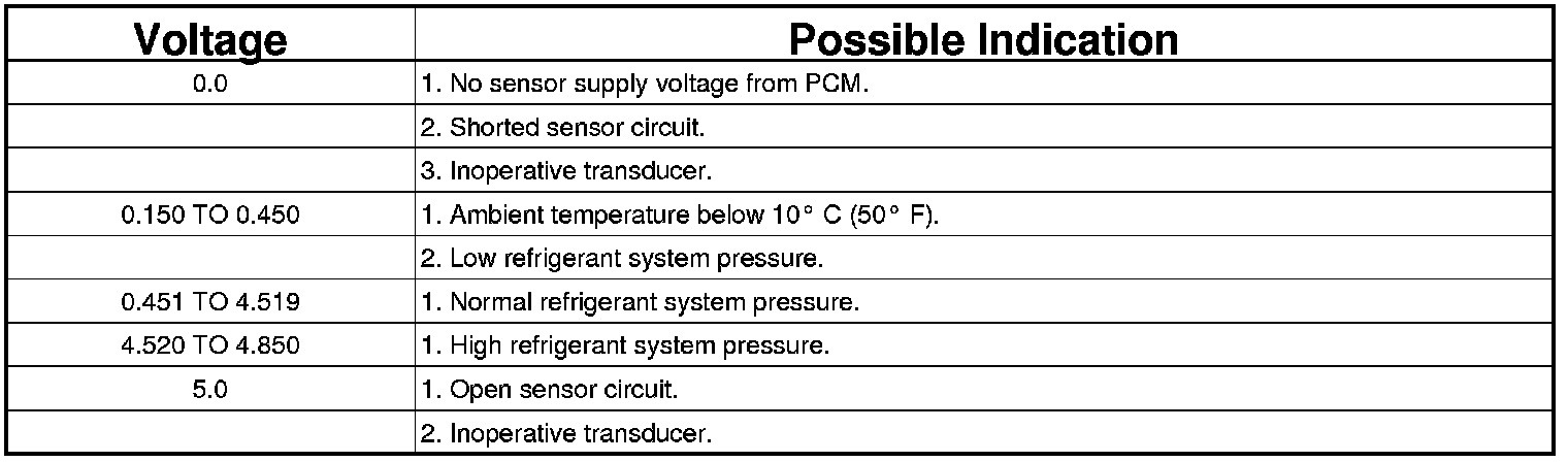 Before testing the A/C pressure transducer, be certain that the transducer wire harness connection is clean of corrosion and properly connected. For the A/C to operate, an A/C pressure transducer voltage reading between 0.451 and 4.519 volts is required. Voltages outside this range indicate a low or high refrigerant system pressure condition to the powertrain control module (PCM). The PCM is programmed to respond to a low or high refrigerant system pressure by suppressing operation of the A/C compressor. Refer to the A/C Pressure Transducer Voltage chart for the possible conditions indicated by the transducer voltage reading.