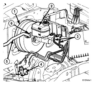 The fluid fill level is indicated on the side of the master cylinder reservoir (2).