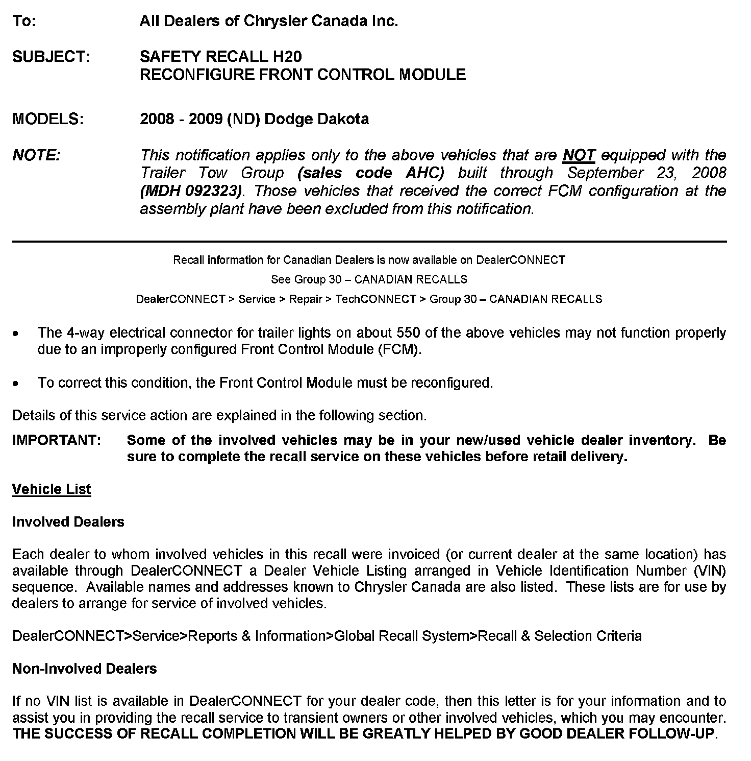 This notification applies only to the above vehicles that are NOT equipped with the Trailer Tow Group (sales code AHC) built through September 23, 2008 (MDH 092323). Those vehicles that received the correct FCM configuration at the assembly plant have been excluded from this notification.