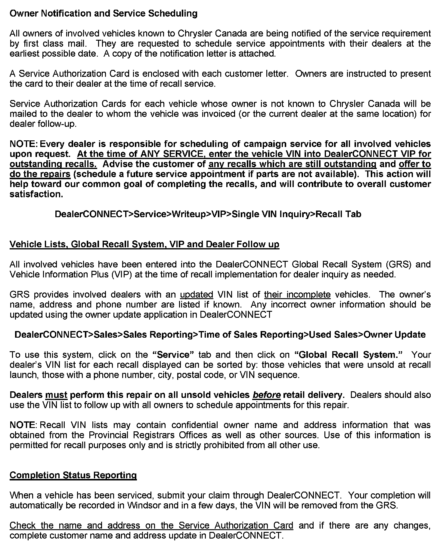 To use the GRS in DealerCONNECT, you first need to click on the Service tab and then in the Repair section click on Global Recall System. Your dealer's VIN list for each Recall can be sorted by: Unsold Vehicles (at the time of Recall launch), Phone Number, City Name, Zip Code (Postal Code) or VIN.