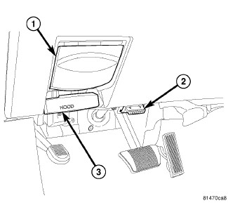The Data Link Connector (DLC) (2) is a 16-way molded plastic connector insulator on a dedicated take out of the instrument panel wire harness. This connector is located at the lower edge of the instrument panel, outboard of the steering column. The connector insulator is retained by integral snap features within a rectangular cutout in the stamped metal lower instrument panel reinforcement, just below the lower edge of the instrument panel steering column opening cover and inboard of the park brake release (1) and inside hood release (3) handles.