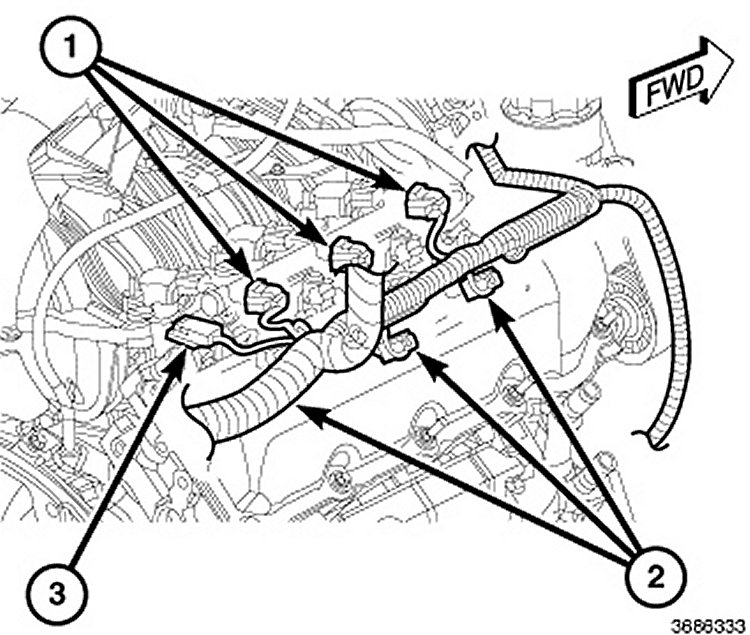 1. Route the left side knock sensor wiring harness (1) down the back of the engine.