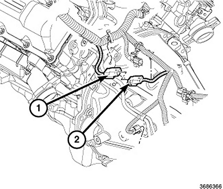 2. Connect the knock sensor wiring harness connector (1) to the transmission wiring harness sensor connector (2).