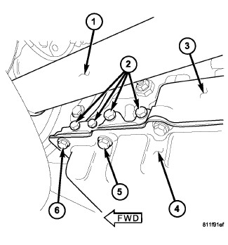 NOTE: Before installing the oil pan bolt (5) in the bolt hole located between the torque converter clutch on and U/D clutch pressure tap circuits, it will be necessary to replentish the sealing patch on the bolt using Mopar(R) Lock & Seal Adhesive.