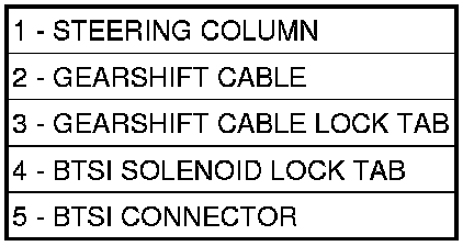 3. Pull upward on both the BTSI lock tab (4) and the gearshift cable lock tab (3).