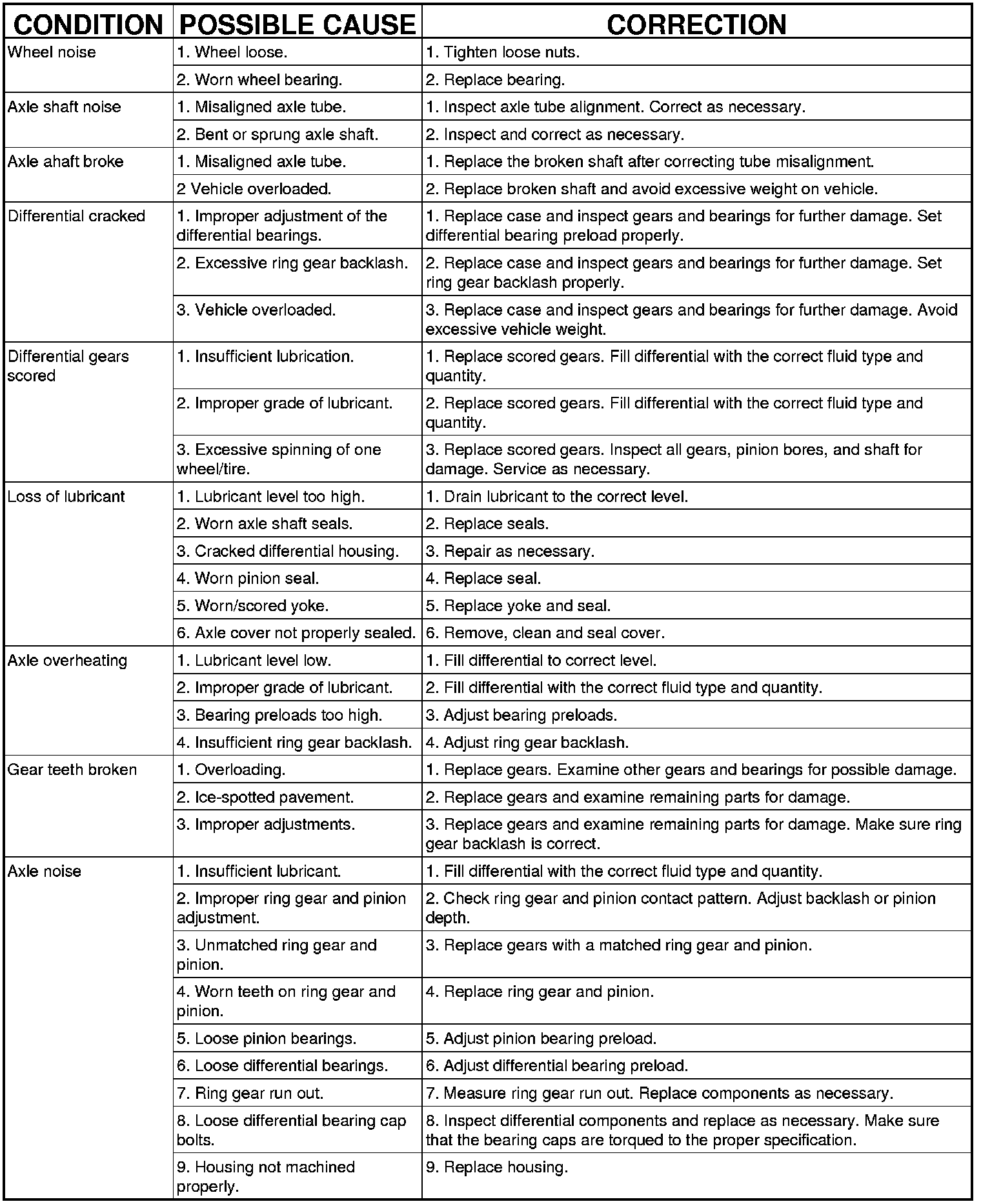 When road testing, first warm up the axle fluid by driving the vehicle at least five miles and then accelerate the vehicle to the speed range where the noise is the greatest. Shift out of gear and coast through the peak noise range. If the noise stops or changes greatly check for:
