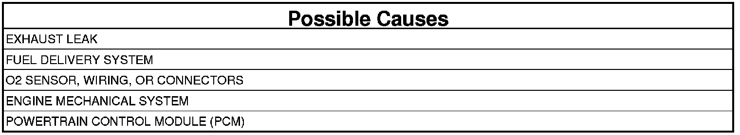 The conditions that cause this diagnostic to fail is when the upstream O2 sensor becomes biased from an exhaust leak, O2 sensor contamination, or some other extreme operating condition. The downstream O2 sensor is considered to be protected from extreme environments by the catalyst. The PCM monitors the downstream O2 sensor feedback control, called downstream fuel trim, to detect any shift in the upstream O2 sensor target voltage from nominal target voltage. The value of the downstream fuel trim is compared with the rich thresholds. Every time the value exceeds the calibrated threshold, a fail timer is incremented and mass flow through the exhaust is accumulated. If the fail timer and accumulated mass flow exceed the fail thresholds, the test fails and the diagnostic stops running for that trip. If the test fails on consecutive trips, a DTC is set.