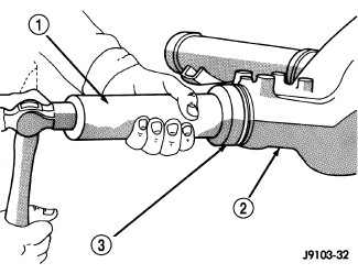 13. Hold companion flange with Holder 6719A (2) and tighten pinion nut with a torque wrench (3) to 285 Nm (210 ft. lbs.).NOTE: Do not exceed the minimum torque 285 Nm (210 ft. lbs.) when installing the pinion nut at this point.