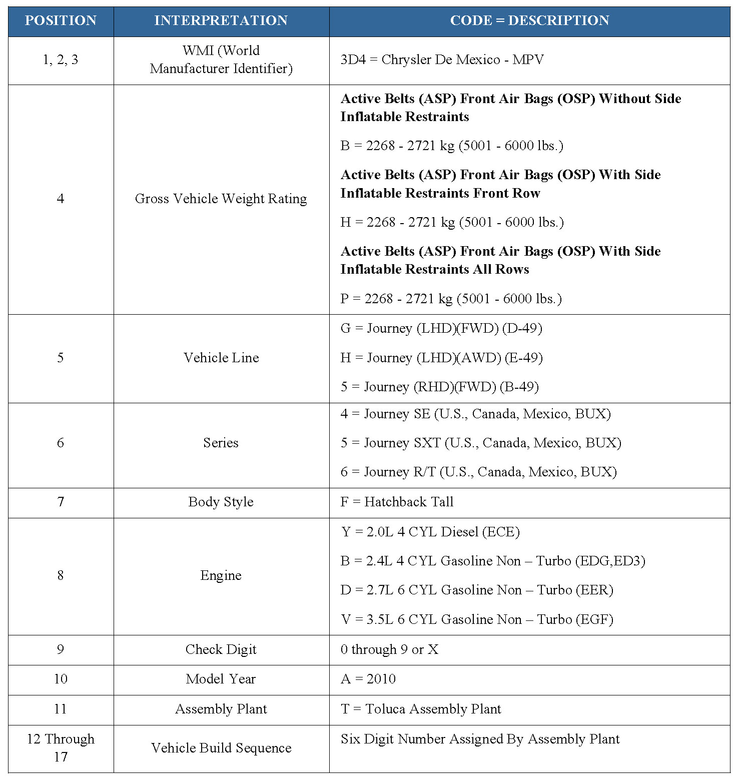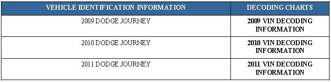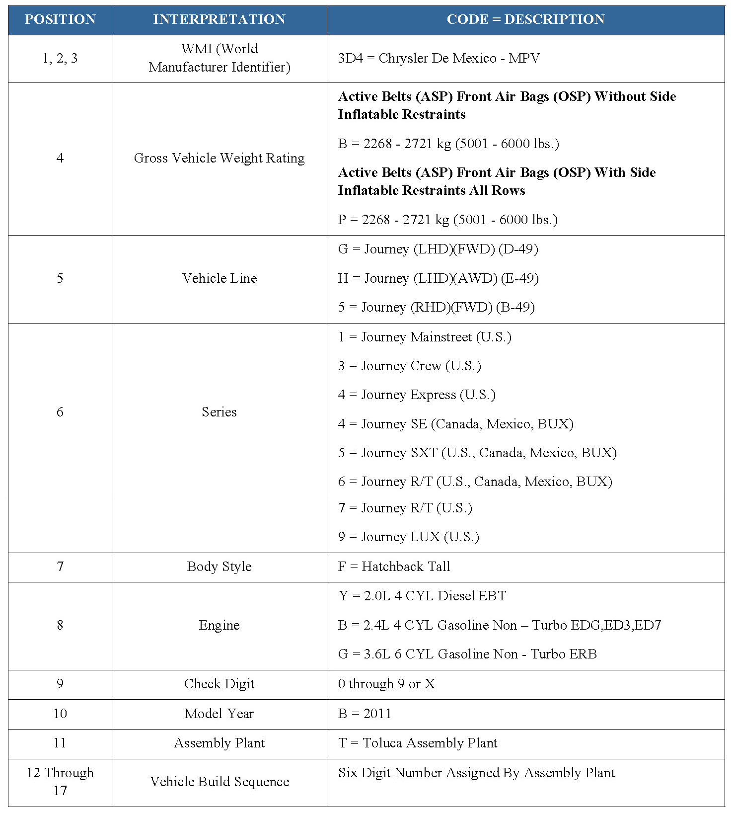 The Vehicle Identification Number (VIN) label (1) is attached to the top left side of the instrument panel. The VIN contains 17 characters that provide data concerning the vehicle. Refer to the decoding chart to determine the identification of a vehicle.