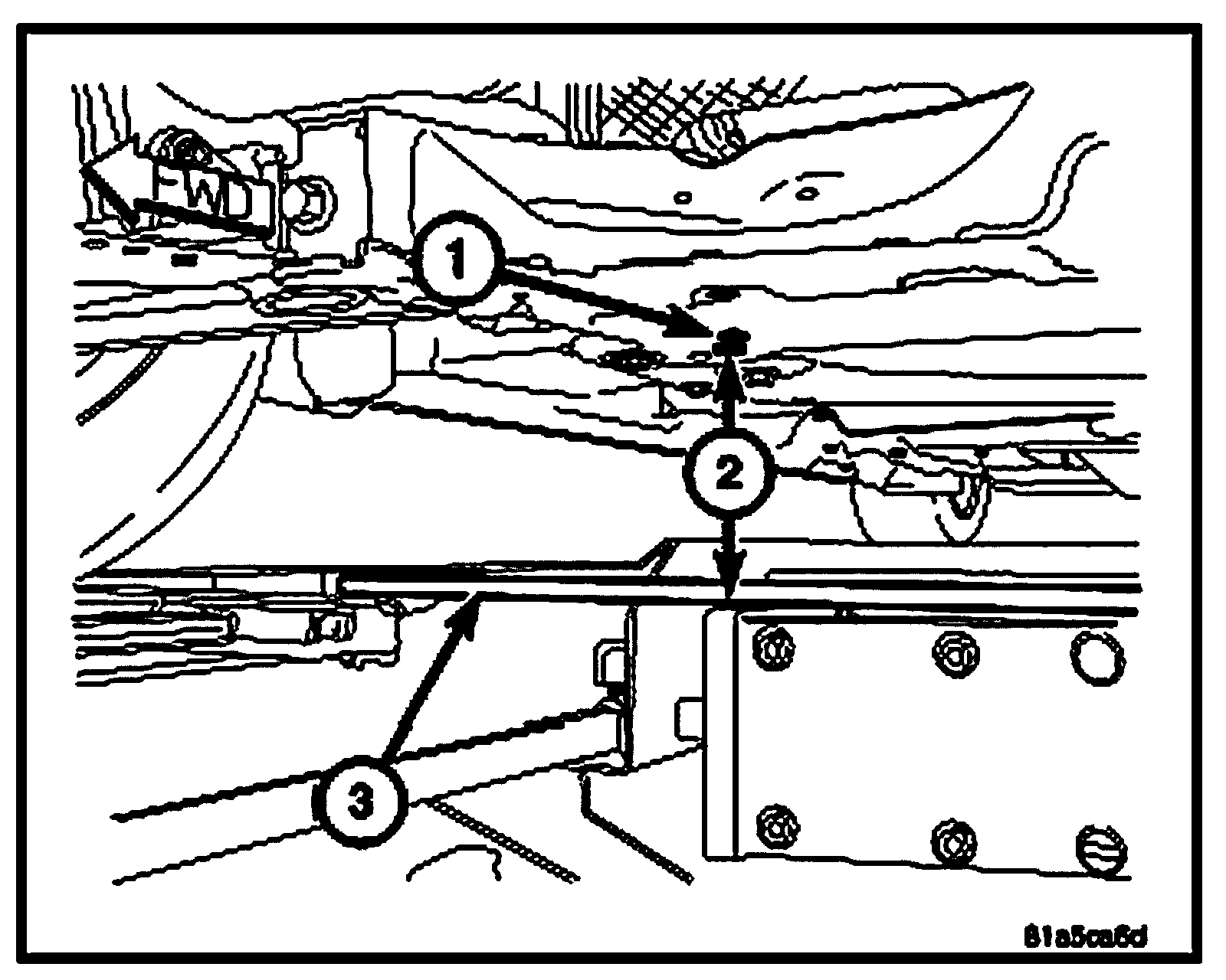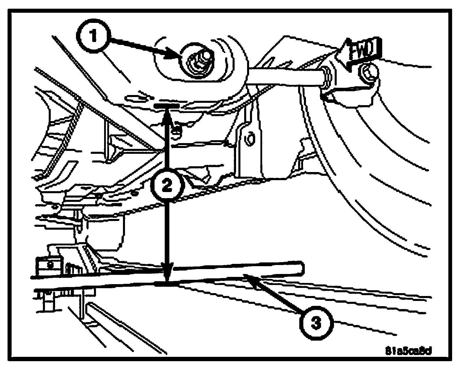 2. Front - On each side of the vehicle, measure the distance 2 from the flat surface behind the PLP hole 1 to the floor or alignment rack/lift runway surface. It may be necessary to measure to the bottom of a straight edge 3, placed from lift runway to runway, to get an accurate measurement.