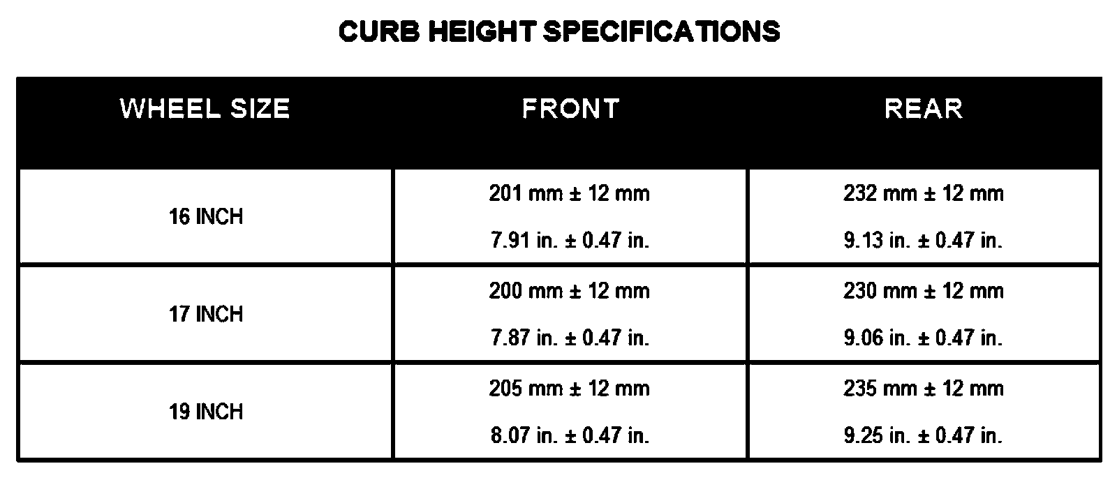 CURB HEIGHT SPECIFICATIONSNOTE: On some vehicles it may be necessary to remove an engine belly pan in order to gain access to the lower control arm pivot bolt.