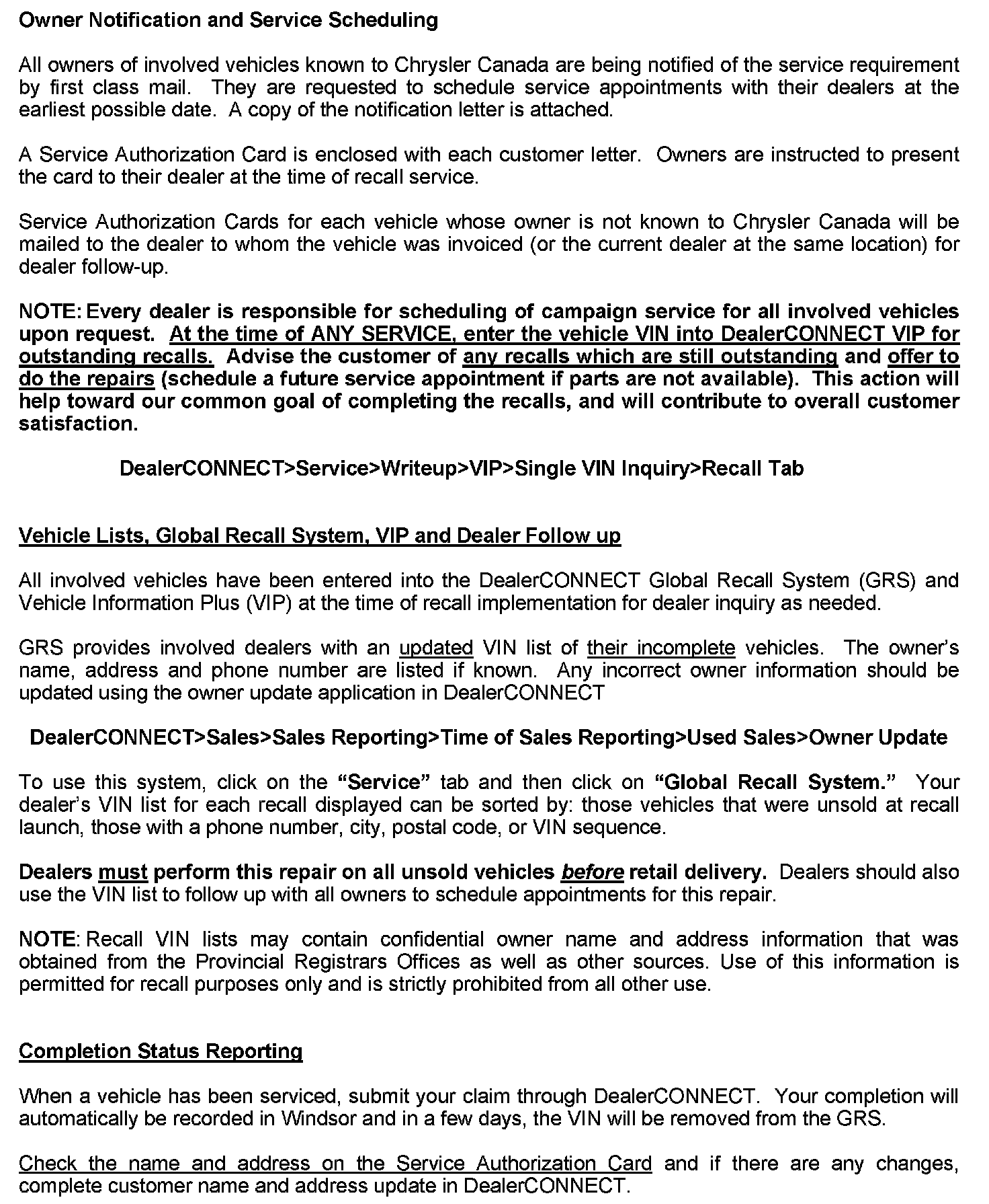 To use the GRS in DealerCONNECT, you first need to click on the Service tab and then in the Repair section click on Global Recall System. Your dealer's VIN list for each Recall can be sorted by: Unsold Vehicles (at the time of Recall launch), Phone Number, City Name, Zip Code (Postal Code) or VIN.