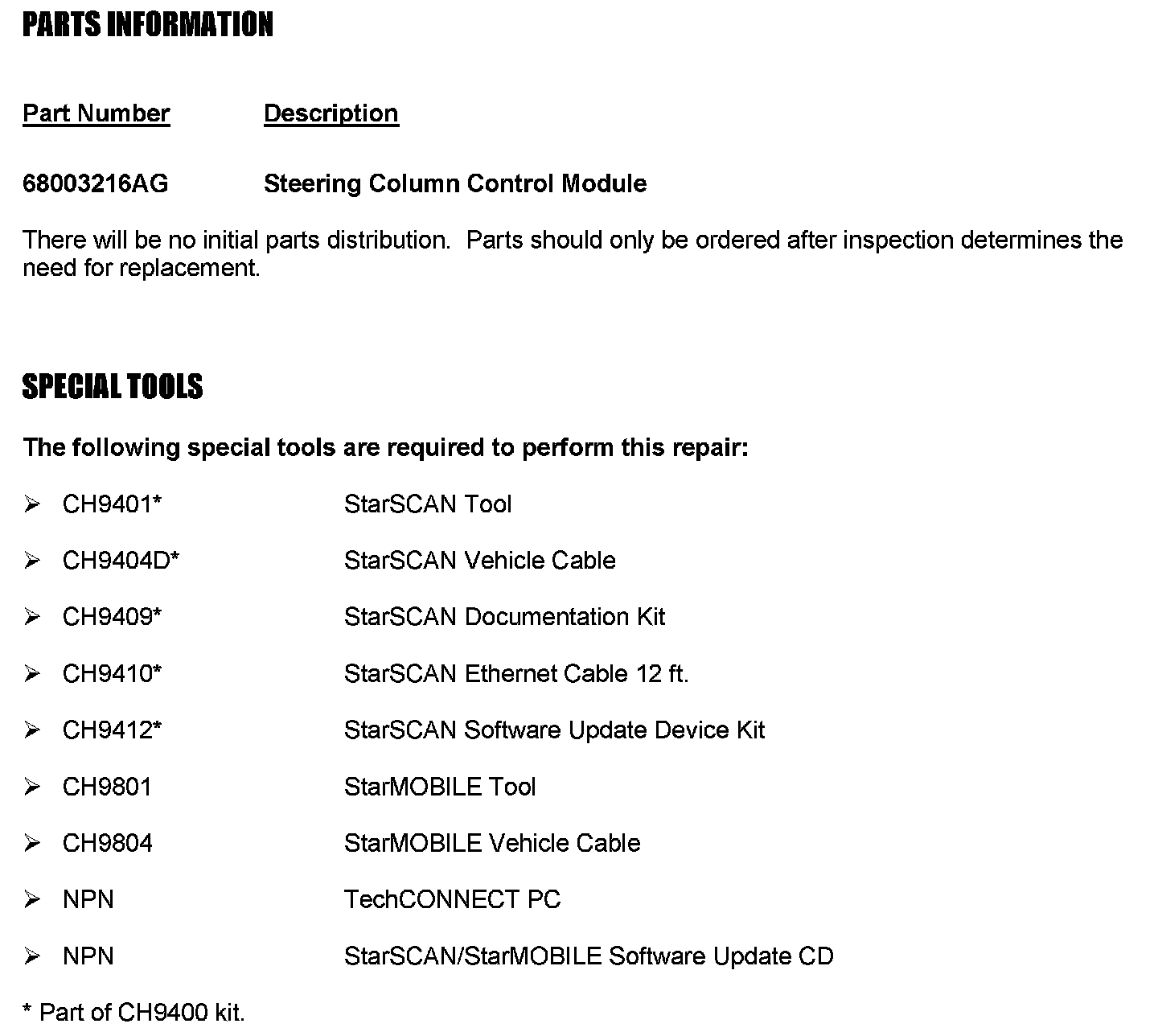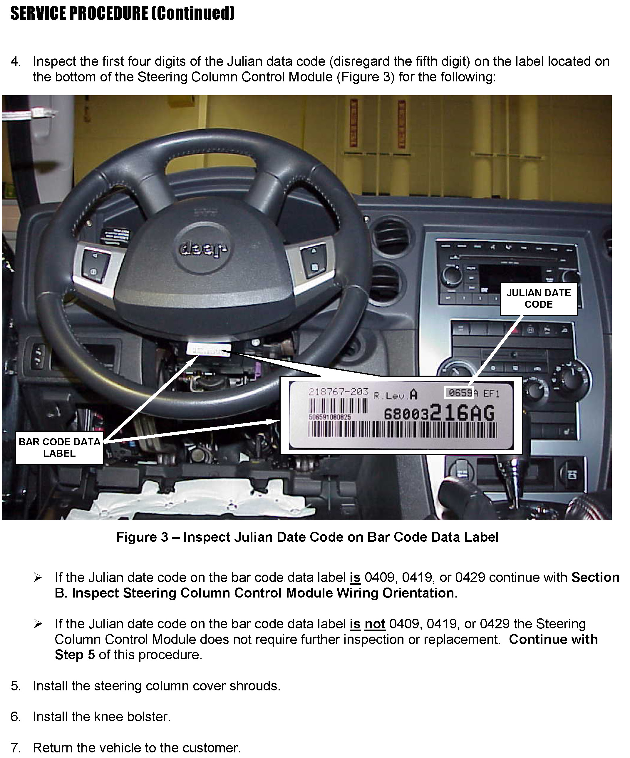 ^ To correct this condition, the Steering Column Control Module build date code must be inspected on all vehicles. Those vehicles that have Steering Column Control Modules with a Julian date code of 0409, 0419, or 0429 must receive an additional inspection on the driver airbag squib wires. Steering Column Control Modules with suspect driver airbag squib wires must be replaced.