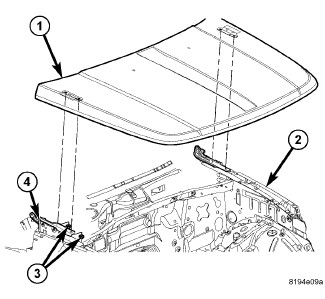 1. With the aid of a helper, the position hood (1) onto the hinges (4).