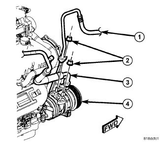 5. Remove the nuts (2) that secure the A/C discharge line (1) and the A/C suction line (3) to the A/C compressor (4).