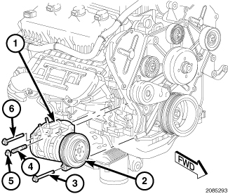 14. Remove the bolt (6) that secures the rear of the A/C compressor to the engine.