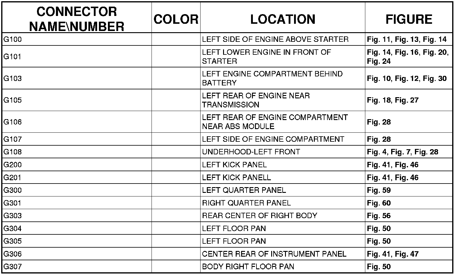 The abbreviation T/O (Take Out) is used in the location column to indicate a point in which the wiring harness branches out to a component.