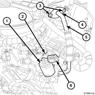 The electronic EGR valve and solenoid assembly (1) is attached to the rear of the right cylinder head (2).