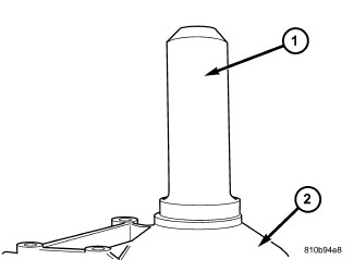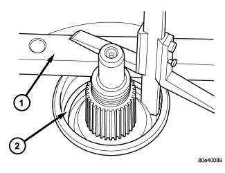 22. Place Gauge Bar 6311 (1) on transmission housing. Using a depth gauge, measure from the gauge bar (1) to the parking lock gear (2).