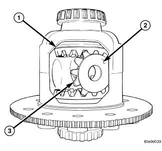 3. Rotate one pinion gear (2) with thrust washer (3) to the differential window (1) and remove the gear.