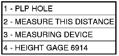 12. Measure and record vehicle's rear curb height. Measure distance (1) between top of Suspension Height Gage (4) and each frame rail at forward edge of Gage. This is the nearest point to the PLP hole (2).