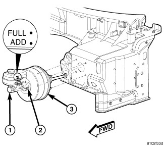 The brake fluid reservoir is marked FULL and ADD indicating the allowable brake fluid level range in the reservoir.