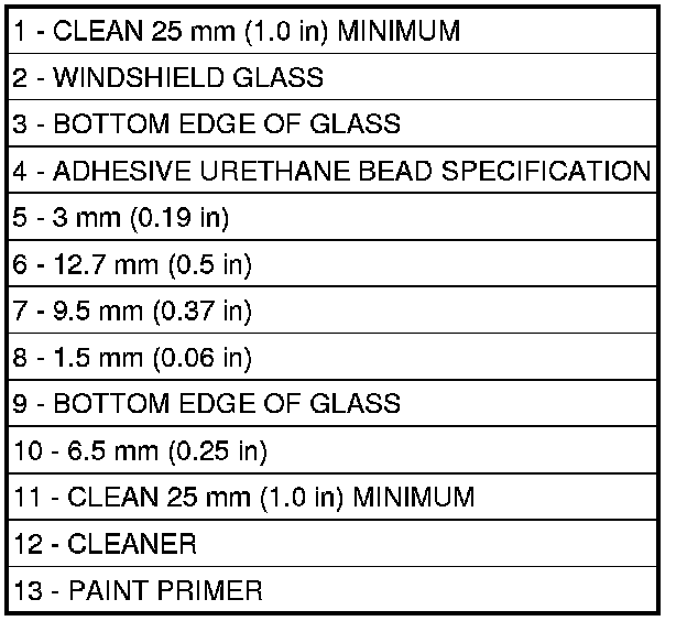 5. Apply black out primer 15 mm (.75 in.) wide on top and sides of windshield and 25 mm (1 in.) on bottom of windshield. Allow at least three minutes drying time.