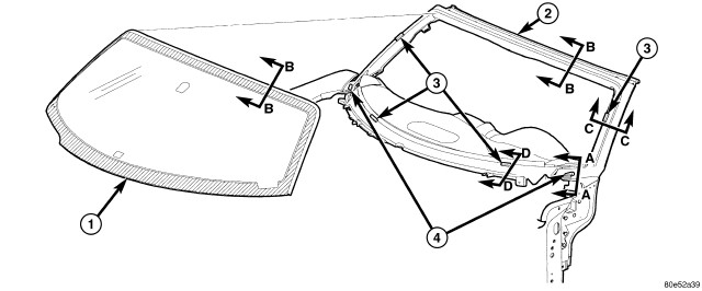 1. Place replacement windshield into windshield opening and position glass in the center of the opening against the support spacers. Mark the glass at the support spacers with a grease pencil or pieces of masking tape and ink pen to use as a reference for installation. Remove replacement windshield from windshield opening.
