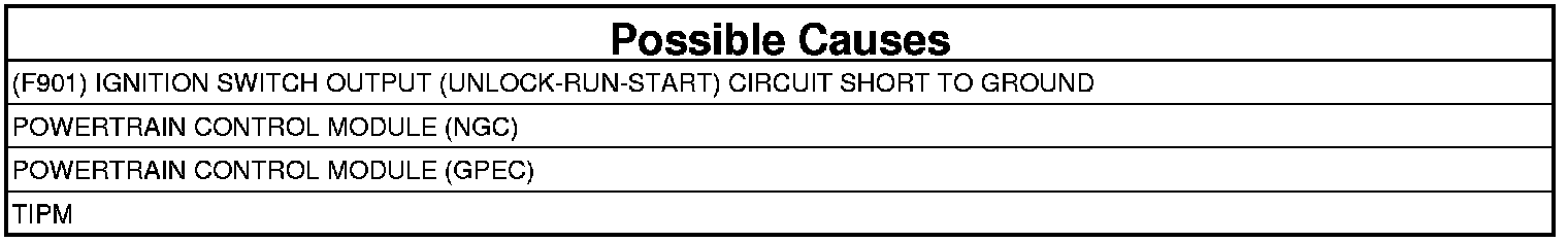 3. (F901) IGNITION SWITCH OUTPUT (UNLOCK-RUN-START) CIRCUIT SHORT TO GROUND
