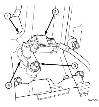 The Crankshaft Position (CKP) sensor (4) is located at the right-rear side of the engine cylinder block (1). It is positioned and bolted into a machined hole in the engine block.