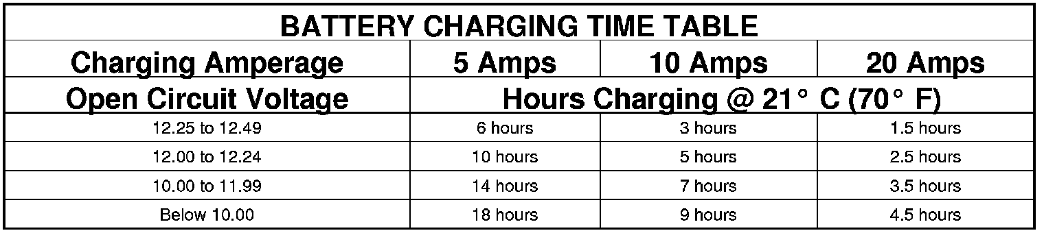 The Battery Charging Time Table gives an indication of the time required to charge a typical battery at room temperature based upon the battery state-of-charge and the charger capacity.