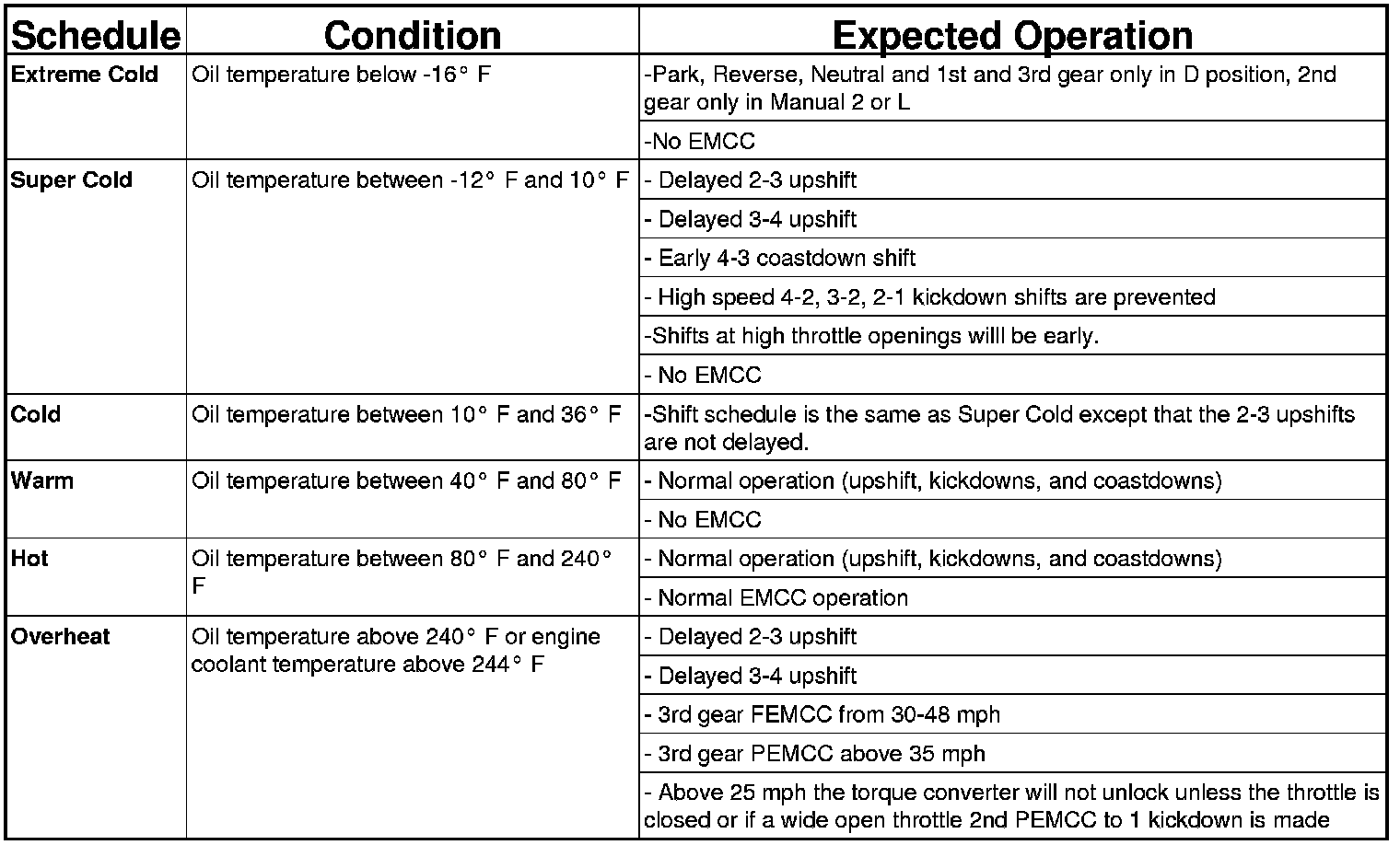 As driving conditions change, the TCM appropriately adjusts the shift schedule. Use the following chart to determine the appropriate operation expected, depending on driving conditions.