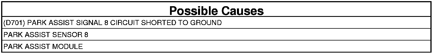 - Repair the (D701) Park Assist Signal 8 circuit for a short to ground.