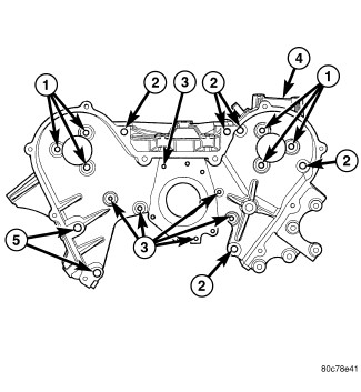 8. Install four inner timing cover to cylinder head bolts (1) and (2). Tighten the bolts to 54 Nm (40 ft. lbs.).