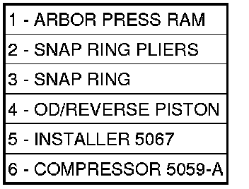 4. Using an arbor press (1)and Disk 6057 (4), install OD/Reverse piston (5) return spring (6) and snap ring (3).