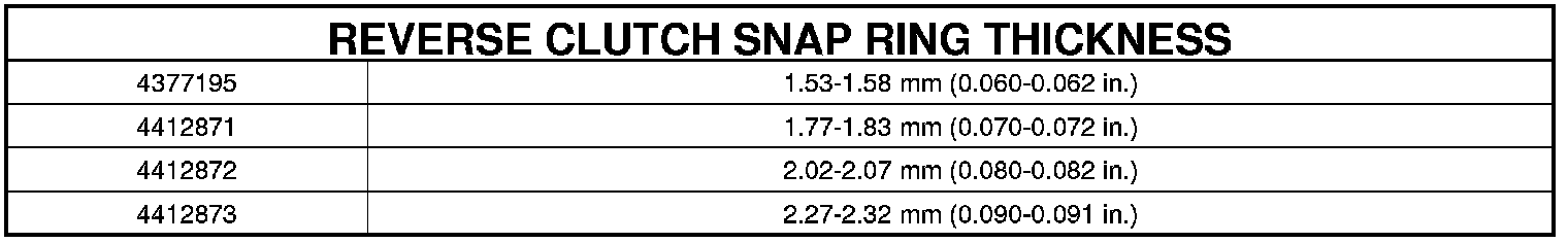 43. Take average of four measurements and compare with reverse clutch pack clearance specification. The reverse clutch pack clearance is 0.89-1.37 mm (0.035-0.054 in.). Select the proper reverse clutch snap ring to achieve specifications: