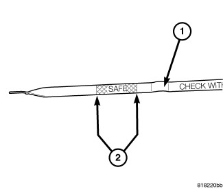 Checking the oil while the vehicle is on level ground will improve the accuracy of the oil level reading. Remove dipstick (1), and observe oil level. Add oil only when the level is at or below the SAFE mark. If the oil level is in the safe (2) range, do not add oil.