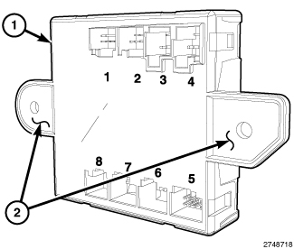 This vehicle is equipped with two electronic front door control modules (1) (also known as a Driver Door Module/DDM, a Passenger Door Module/PDM or Front Door Multiplex/MUX Modules), one each on both the driver and passenger front doors. Each door control module is concealed behind the front door trim panel where it is secured through two integral mounting tabs (2) to the door hardware module carrier by two screws. The front door control modules are located in the upper front corner of the front door hardware carriers, just below the mirror flag area of the front door.