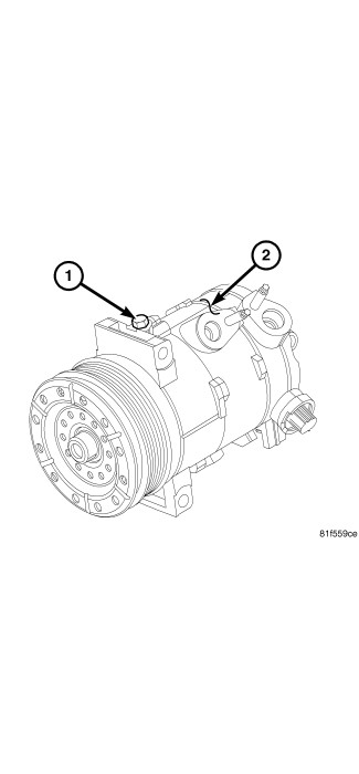 1. Place the new A/C compressor (2) on a workbench and remove the drain plug (1).