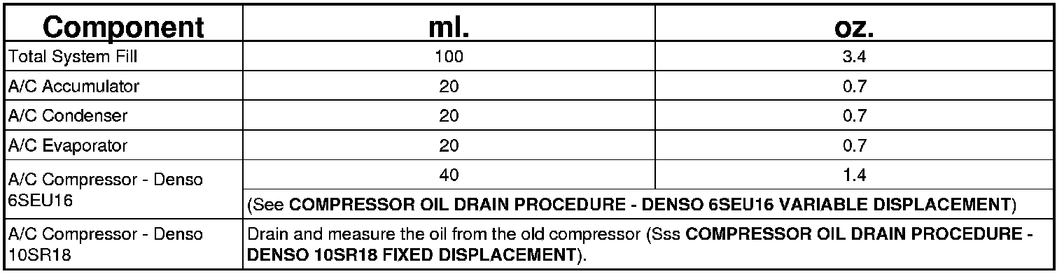 NOTE: When replacing multiple A/C system components, see to the Refrigerant Oil Capacities chart to determine how much oil should be removed from the new A/C compressor (example: new 6SEU16 compressor and accumulator requires 60 ml. (2.1 oz.) of oil to be added to the system. 100 ml. (3.4 oz.) of oil is in new compressor. 100 ml. (3.4 oz.) minus 60 ml. (2.1 oz.) equals 40 ml. (1.4 oz.) oil to be drained from new compressor).