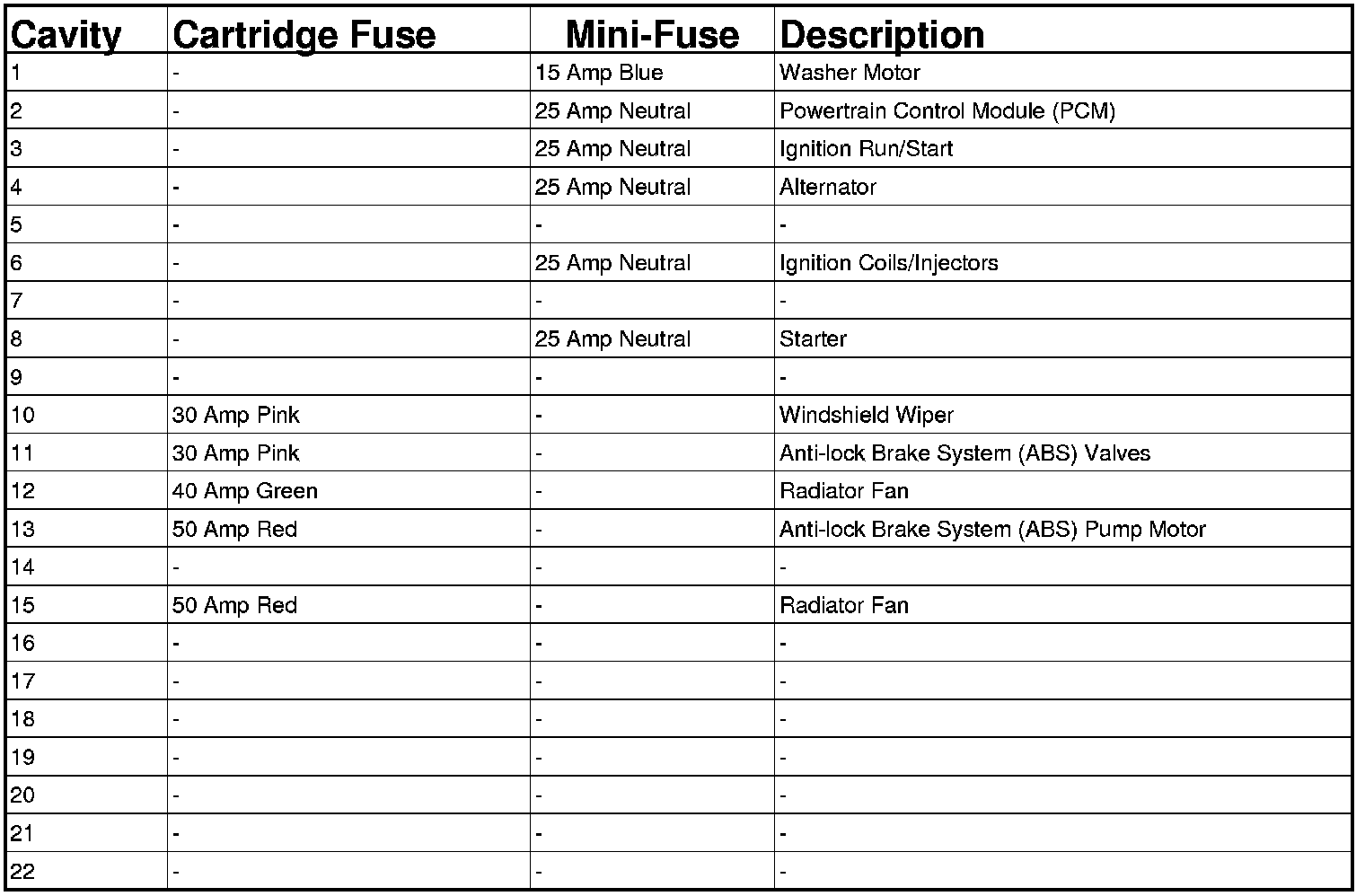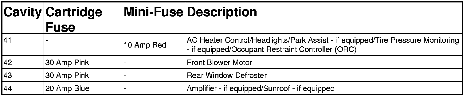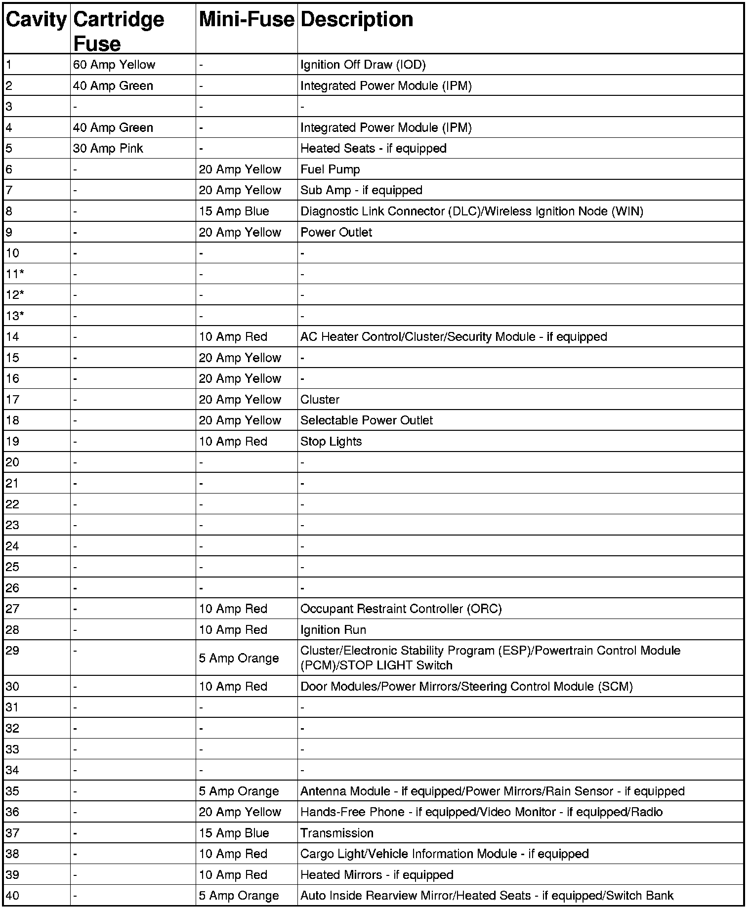 *Cavities 11, 12, and 13 contain self-resetting fuses (circuit breakers) that are only serviceable by an authorized dealer. The Cluster (without power memory seat), the Driver Seat Switch (with power memory seat), and the Memory Module (if equipped) are fused by the 25 amp circuit breaker in Cavity 11. The Passenger Seat Switch is fused by the 25 amp circuit breaker in Cavity 12. The Door Modules (except base), the Driver Door Lock Switch (base), the Driver Express Power Window Switch (if equipped), and the Passenger Door Lock Switch (base) are fused by the 25 amp circuit breaker in Cavity 13. If you experience temporary or permanent loss of these systems, see your authorized dealer for service.