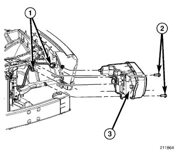 5. Install and tighten the three screws (2) that secure the front lamp unit to the radiator closure panel. Tighten the screws securely.
