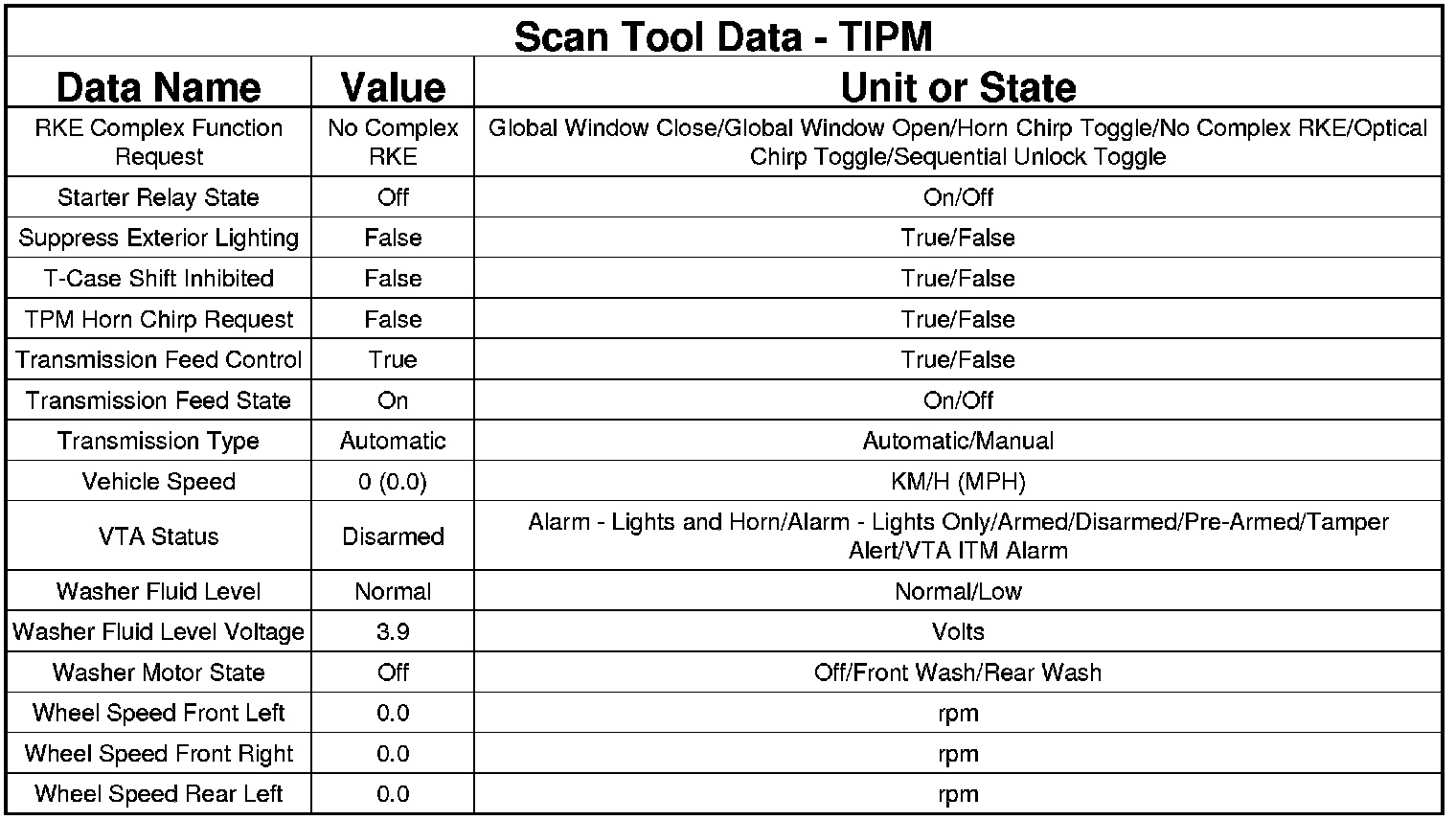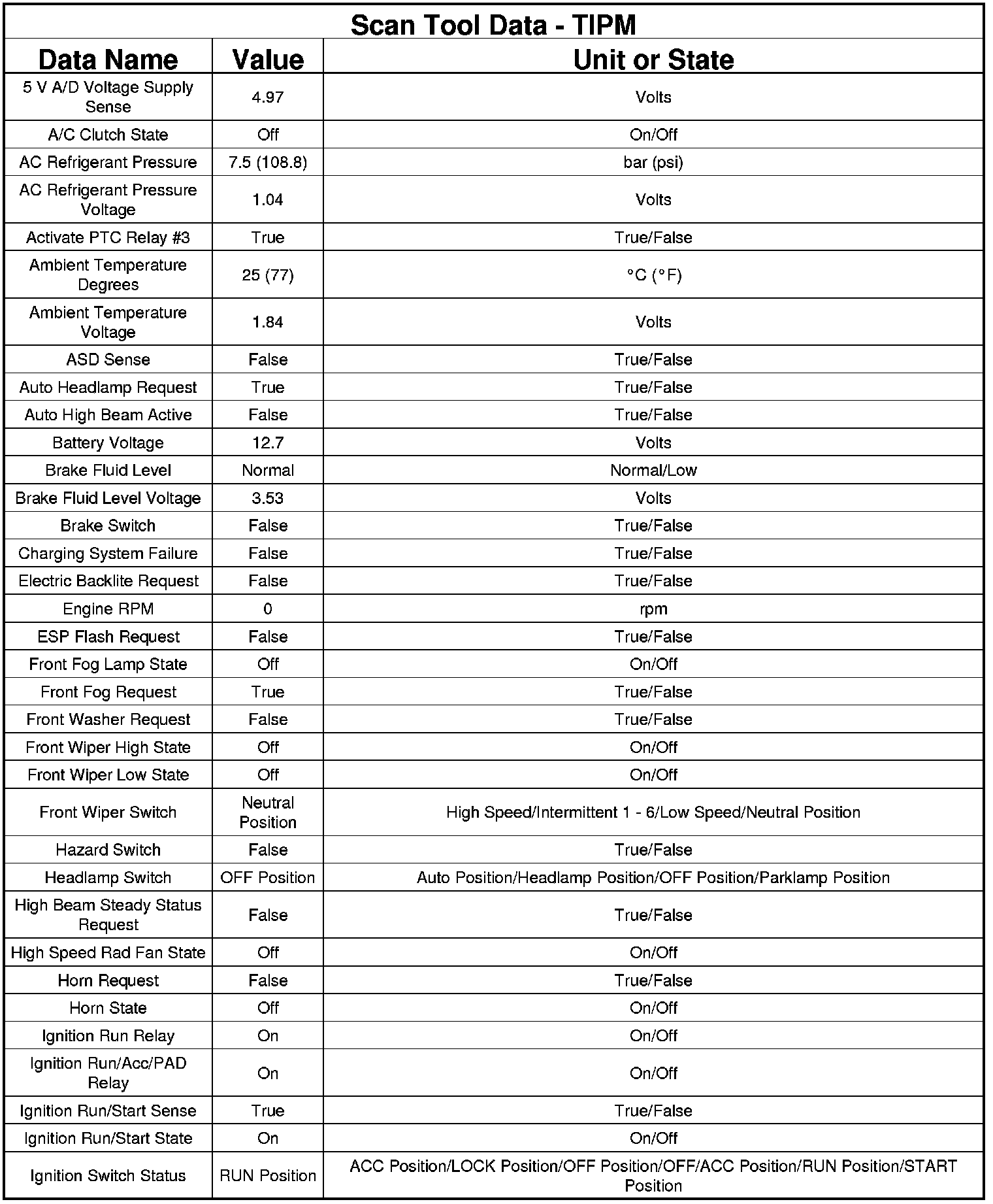 The following chart lists data values taken from the Scan Tool Totally Integrated Power Module (TIPM) data list. The data is to be used for reference only.
