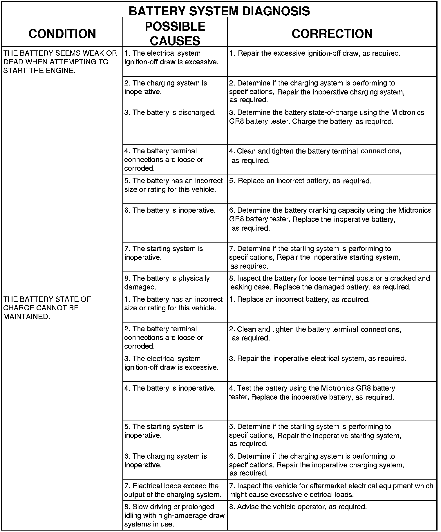 The battery, starting, and charging systems in the vehicle operate with one another and must be tested as a complete system. In order for the engine to start and the battery to maintain its charge properly, all of the components that are used in these systems must perform within specifications. It is important that the battery, starting, and charging systems be thoroughly tested and inspected any time a battery needs to be charged or replaced. The cause of abnormal battery discharge, overcharging or early battery failure must be diagnosed and corrected before a battery is replaced and before a vehicle is returned to service. The service information for these systems has been separated within this service manual to make it easier to locate the specific information you are seeking. However, when attempting to diagnose any of these systems, it is important that you keep their interdependency in mind.