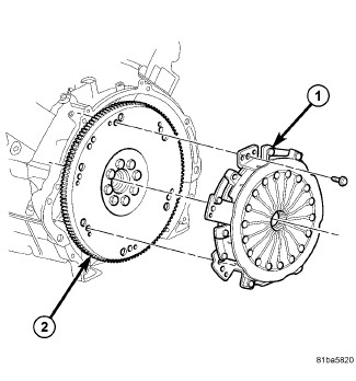 4. Install clutch assembly (1) onto the flywheel (2). Install clutch housing and transmission TR6060 Manual Transmission - Installation.